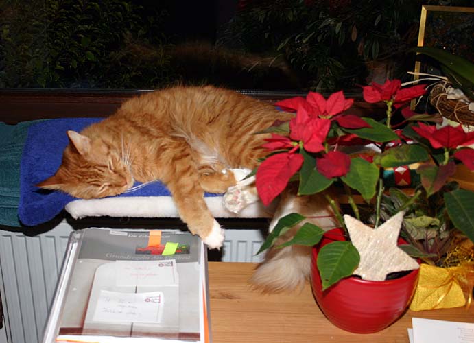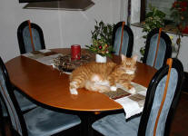 | Die „Frauchen“ und „Herrchen“ sind über Silvester in Urlaub gefahren. Deshalb feiern Isabella und Ikarus sowie Odin und Wotan ihr Silvester bei Flory. Also ein Dinner for Five! Zunächst gilt es sich Lieblingsplätze zu reservieren. |